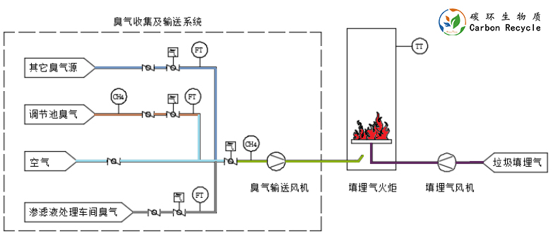 公司在武漢某垃圾填埋場對原有填埋氣火炬改造,目的是利用新火炬系統(tǒng)在燃燒填埋氣時(shí)燃燒產(chǎn)生的熱量,對于填埋場滲濾液處理設(shè)施產(chǎn)生的臭氣進(jìn)行熱氧化除臭。垃圾滲濾液調(diào)節(jié)池及垃圾滲濾液處理車間產(chǎn)生的臭氣集中收集后用管道通過風(fēng)機(jī)輸送至火炬配風(fēng)口混入火炬焚燒。在臭氣管道上設(shè)置氣體濃度分析儀、緊急切斷閥等安全保護(hù)裝置,保護(hù)裝置與輸送風(fēng)機(jī)、火炬連鎖控制。