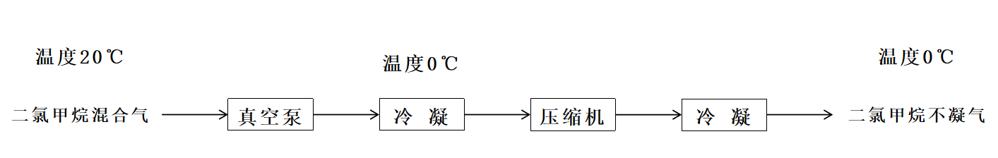以二氯甲烷和空氣的混合氣為例:20℃時二氯甲烷的飽和蒸氣壓是47.39KPa,由公式(2)計算可知,此時二氯甲烷在混合氣中的含量約為46.8%??紤]到真空泵前后的氣體壓力變換不大,將該混合氣降到0℃。0℃時二氯甲烷的飽和蒸氣壓是19.2KPa,二氯甲烷在混合氣中的比例約為18.9%。由此可以看出,采用圖(1)所示的流程,將二氯甲烷和空氣的混合氣由20℃降為0℃,約有74%的二氯甲烷冷凝析出變?yōu)橐后w溶劑。但是仍有26%的二氯甲烷不凝氣體隨混合氣體進(jìn)入后續(xù)廢氣處理裝置。