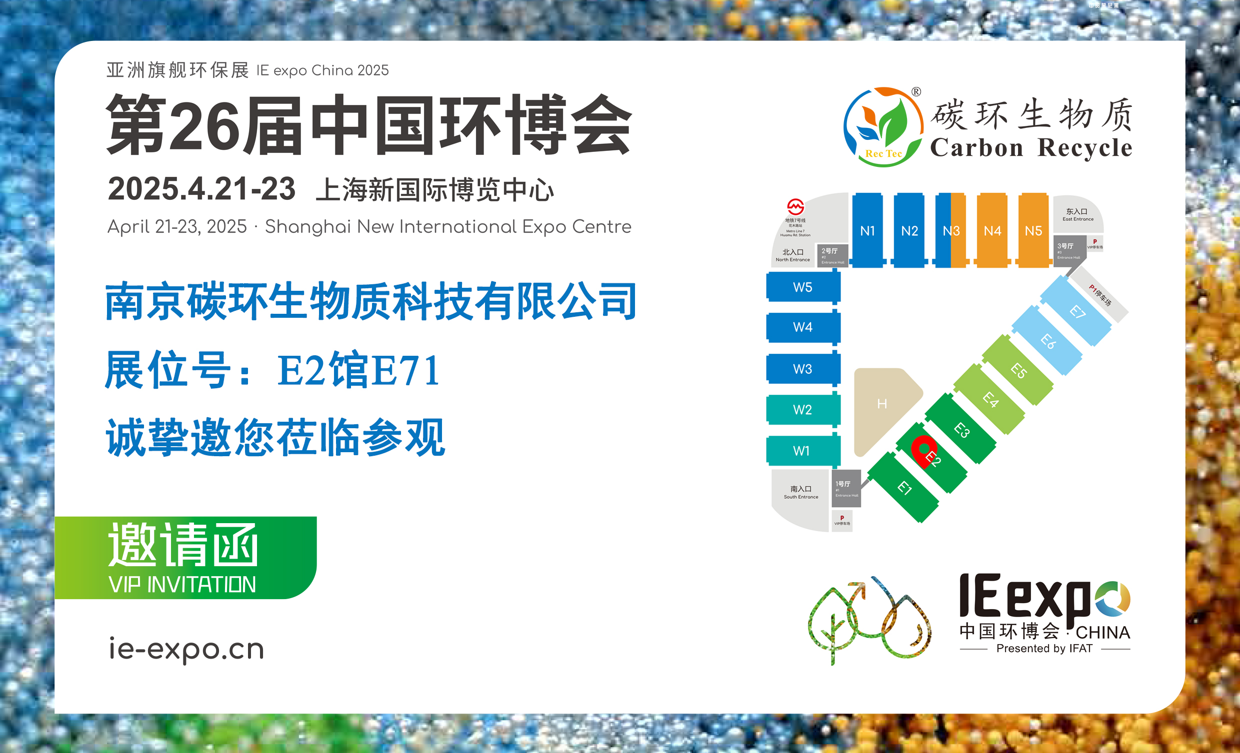 南京碳環(huán)生物質(zhì)科技有限公司將于2025年4月21-23日在上海新國際博覽中心參加第26屆中國環(huán)博會(IEexpo China 2025),誠摯邀請您蒞臨參觀。